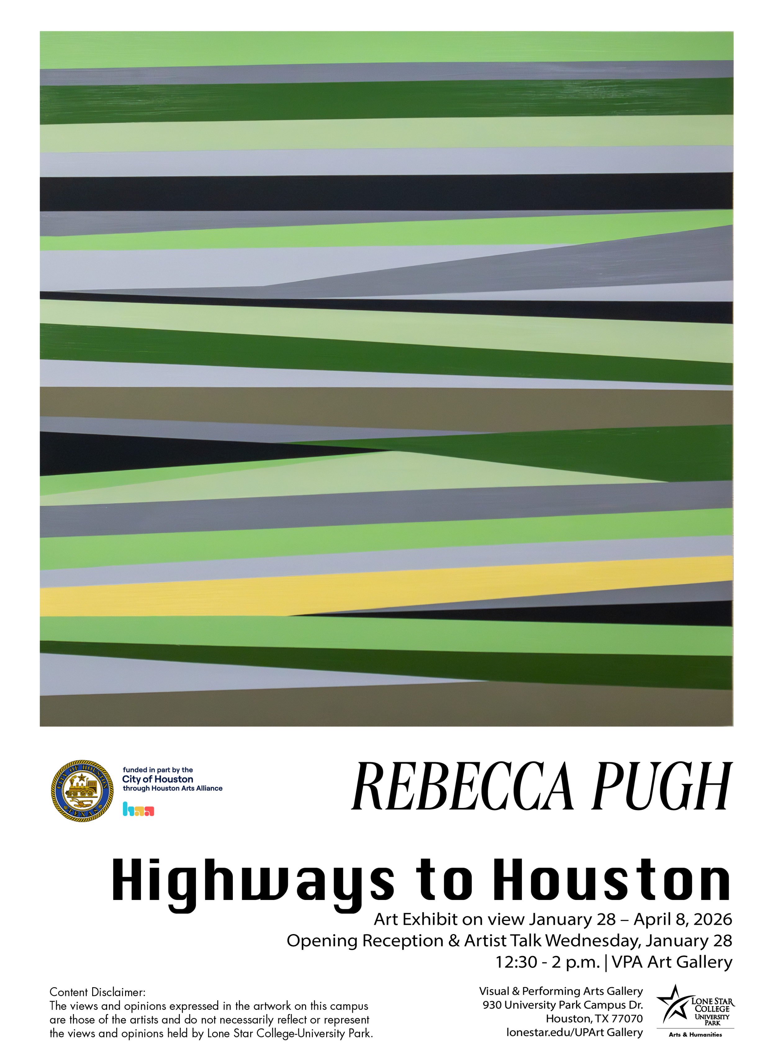 Rebecca Pugh presents “Highways to Houston,” a solo exhibition of abstract paintings in the Visual & Performing Arts (VPA) Gallery at Lone Star College - University Park. The abstract paintings are inspired by the artist driving between Houston and College Station, TX, for work as an Instructional Assistant Professor at Texas A&M University. The exhibition “Highways to Houston” is funded in part by the City of Houston through Houston Arts Alliance.